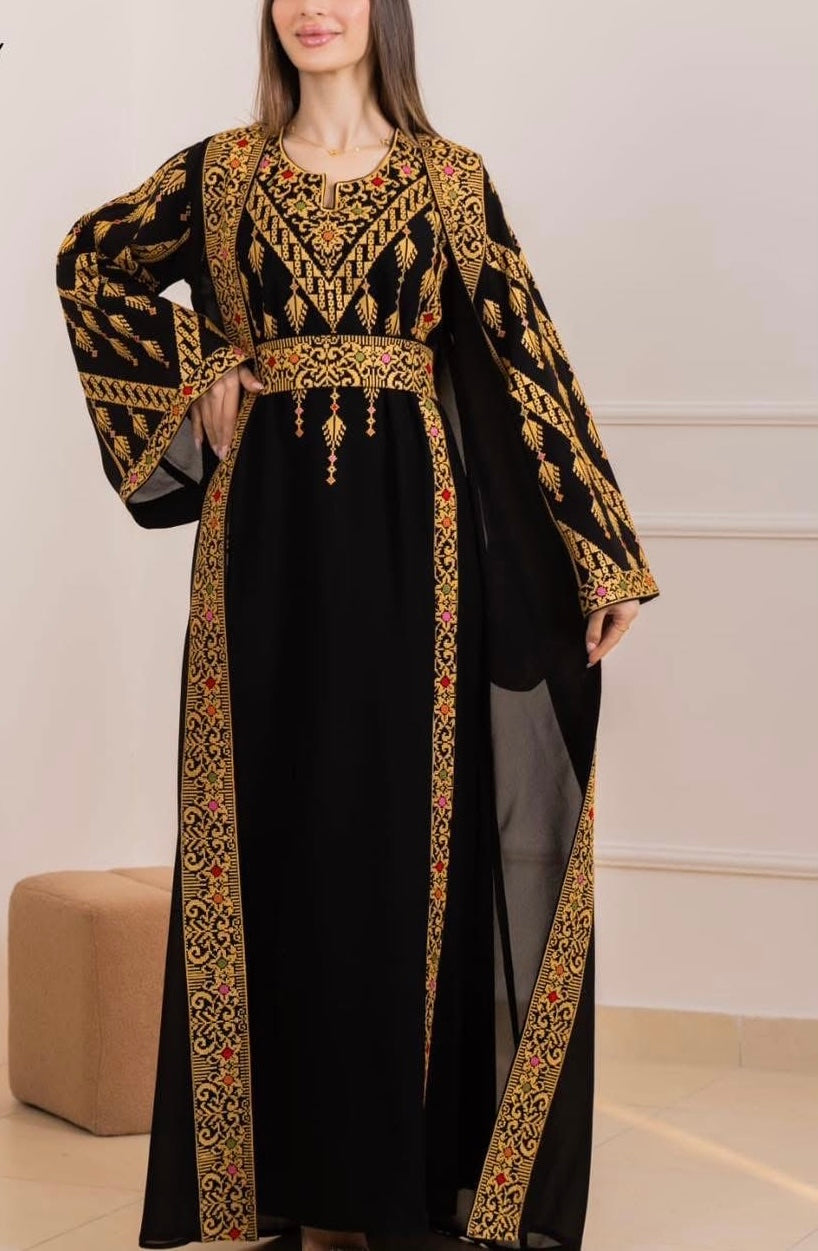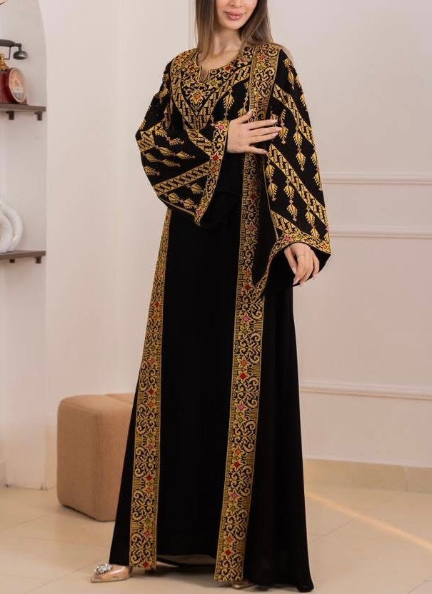 Rawnaq Black With Golden Dress and Abaya Set with Palestinian Embroidery