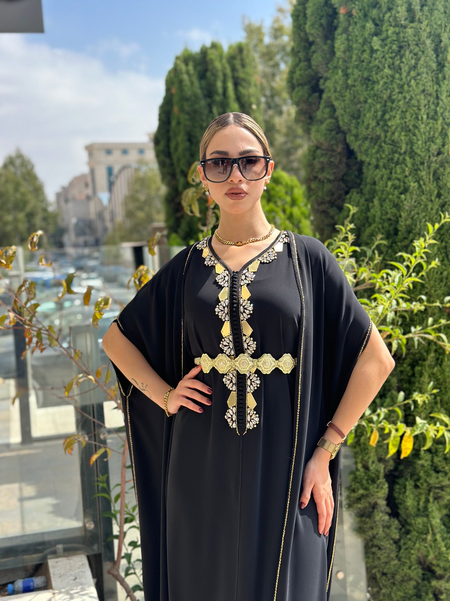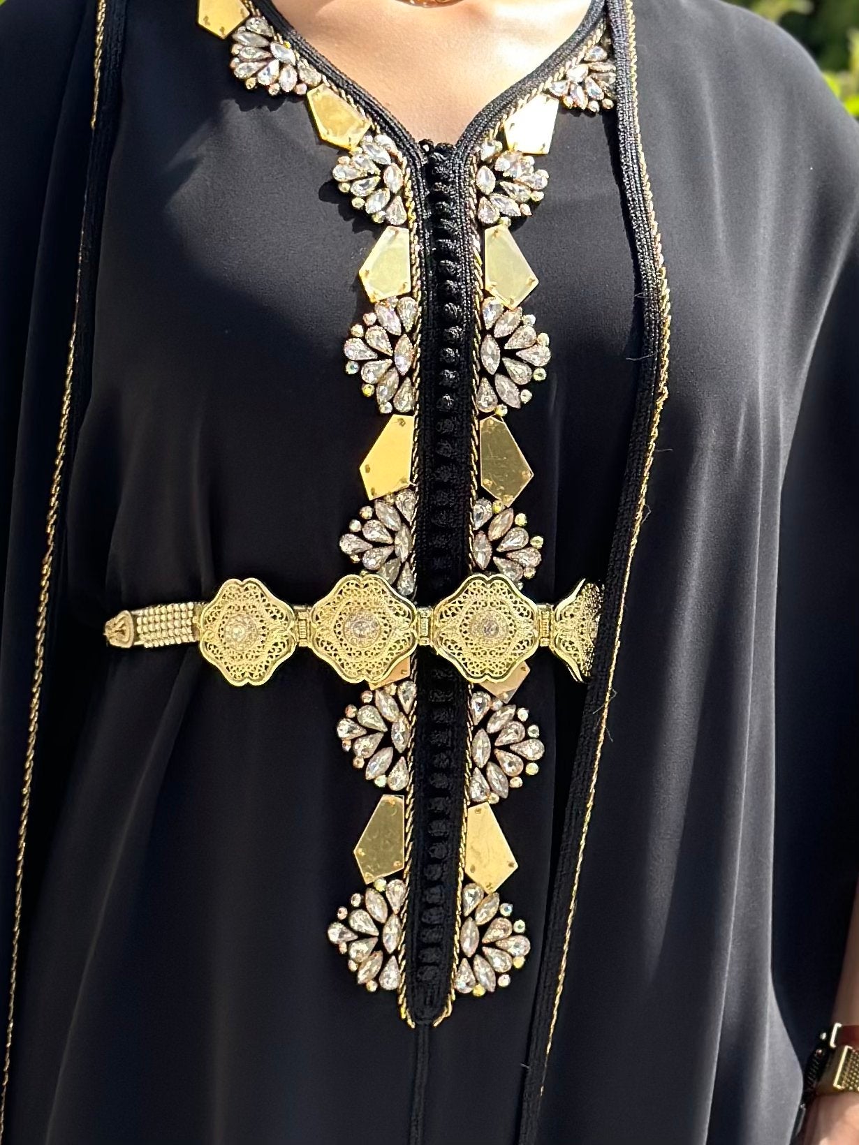 Handcrafted Excellence: Embrace elegance with this stunning sleeveless black caftan, meticulously handmade by skilled Moroccan artisans. Intricate gold detailing and hand-embellished stones add a luxurious touch, making it perfect for creating unforgettable memories. With only one piece available, you’ll truly stand out in any setting. Don’t miss your chance to own this unique piece—order yours today!