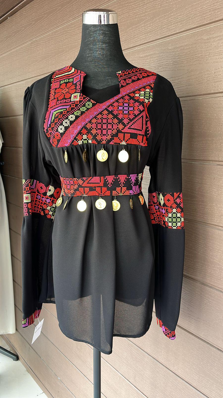 Amazing new design chiffon embroidered blouse with beautiful colorful Palestinian embroidery and coin details