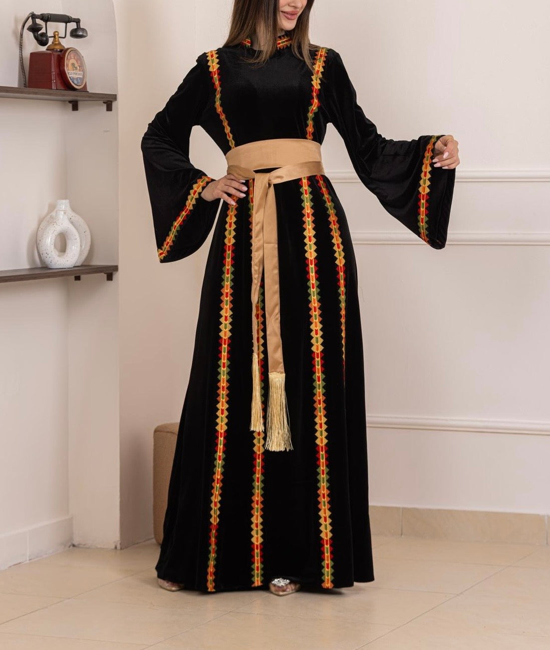 Black Velvet Elegance Stripes Embroidered Dress with Satin Belt