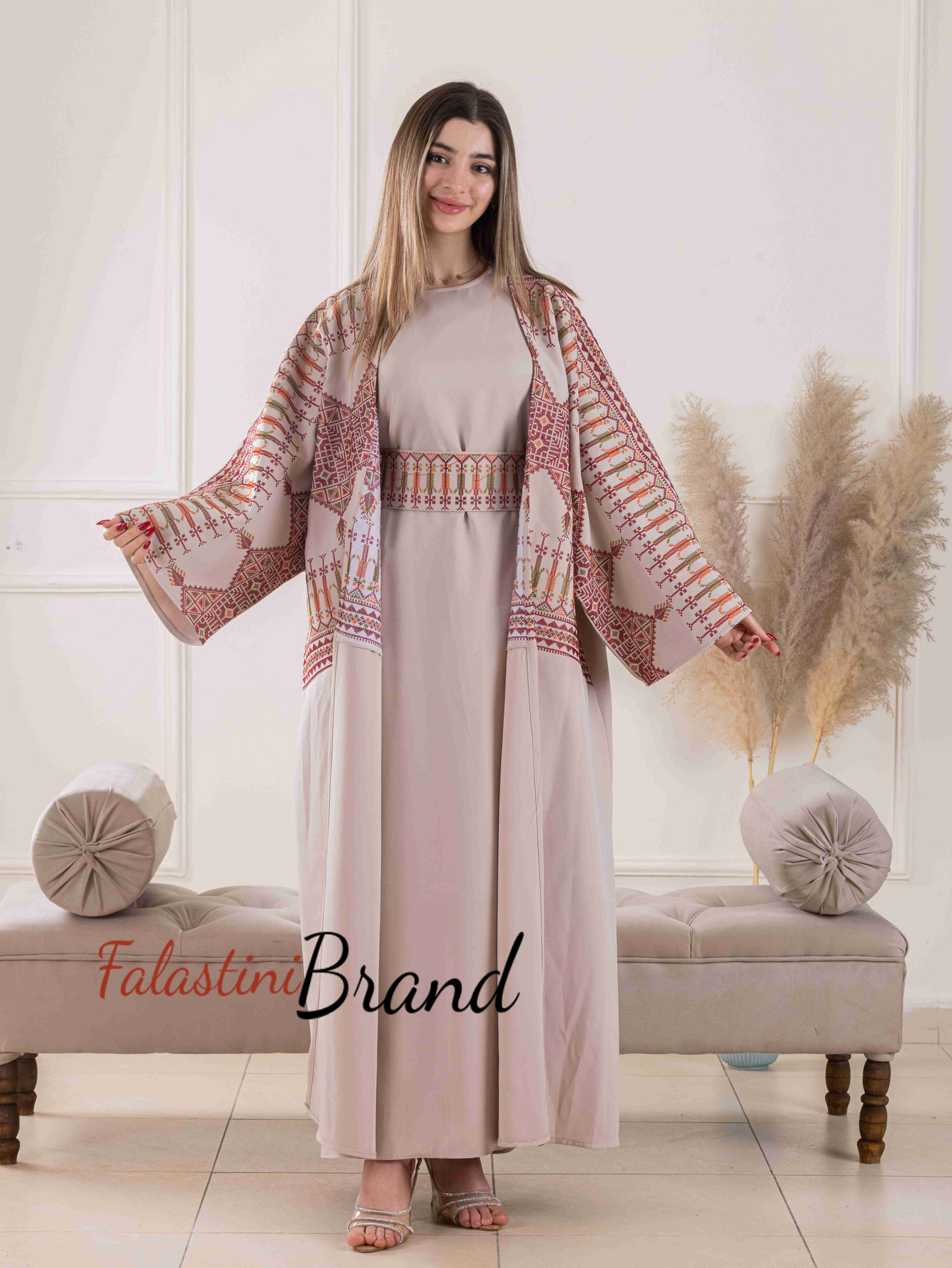 Elegant Beige Dress and Abaya Set with Palestinian Embroidery