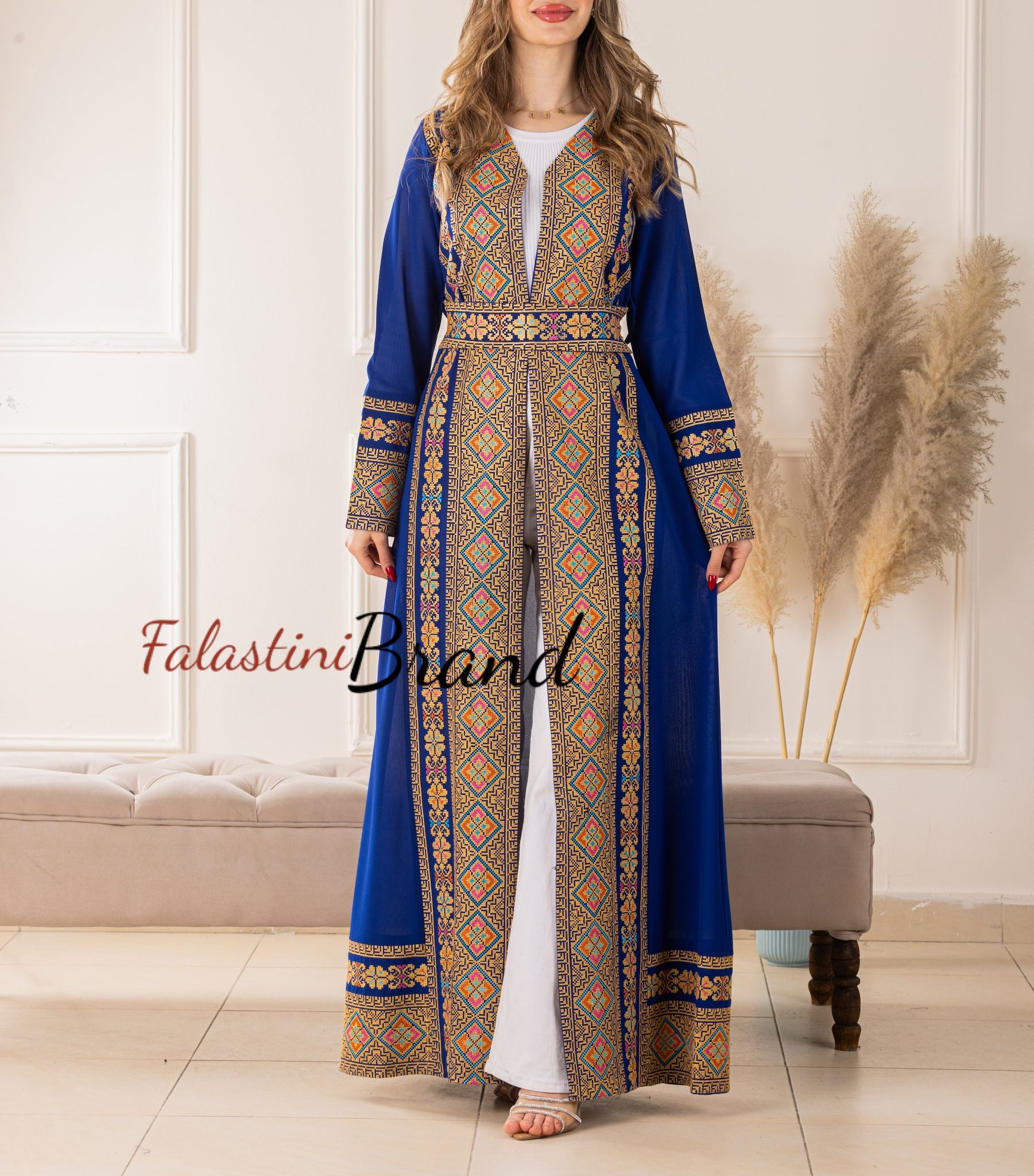 Elegant Palestinian Blue Chiffon Embroidered Open Abaya Kaftan Long Sleeve With Stylish Embroidery