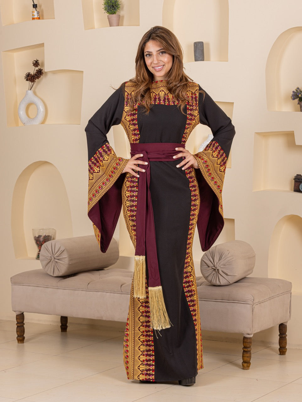 Hooraya Black and Burgundy Thob Dress with Golden Embroidery