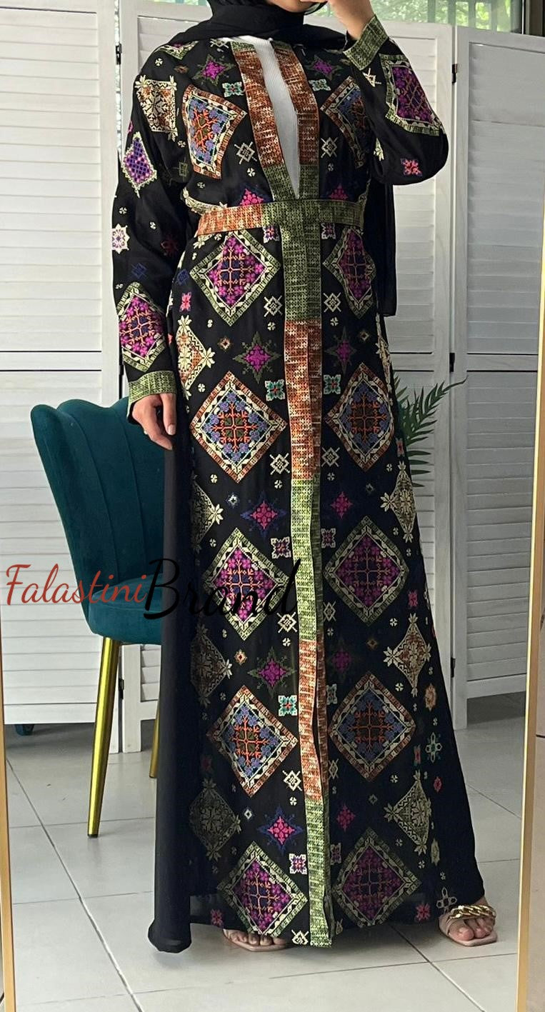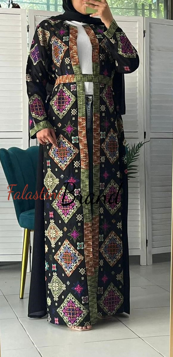 Stylish Black and Colorful Georgette Diamond Embroidered Open Abaya Kaftan