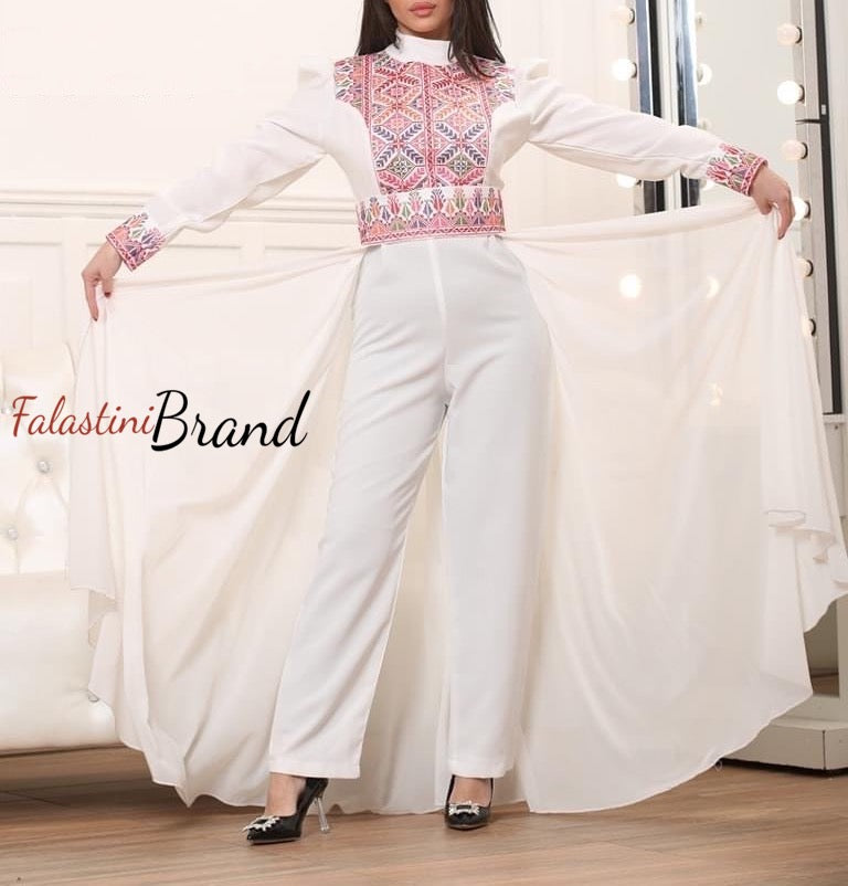 Stylish White Jumpsuit Dress Floral Palestinian Embroidery