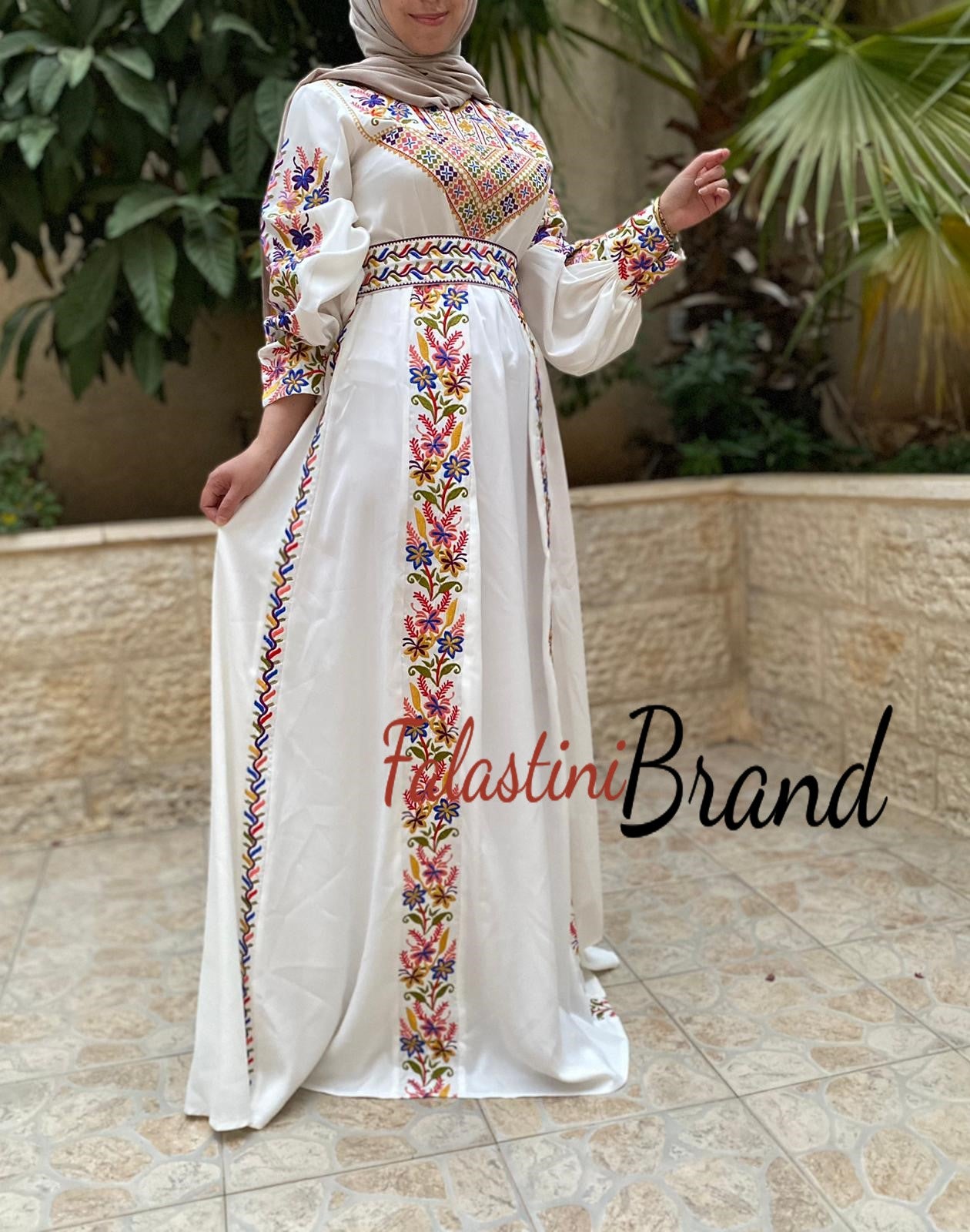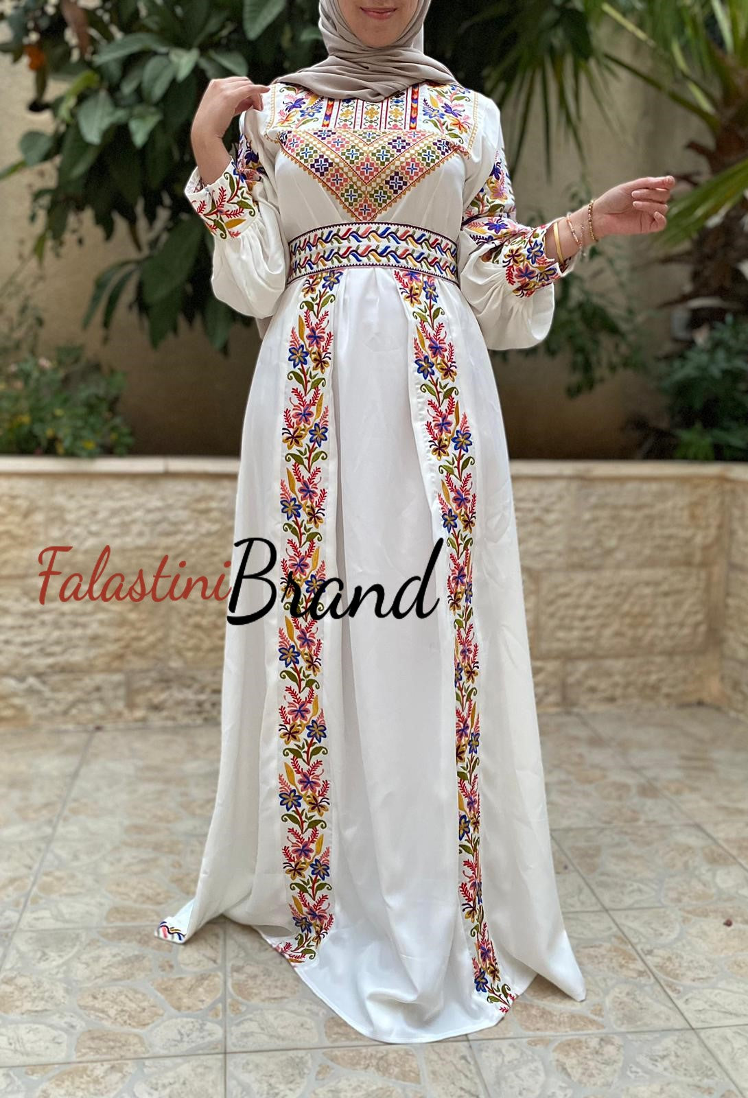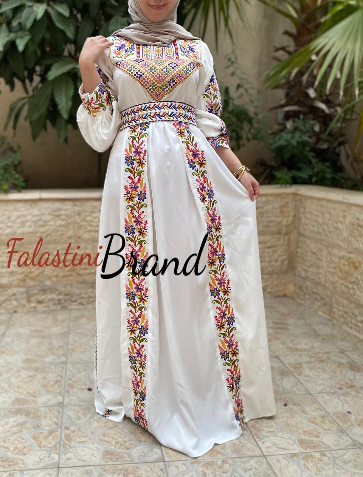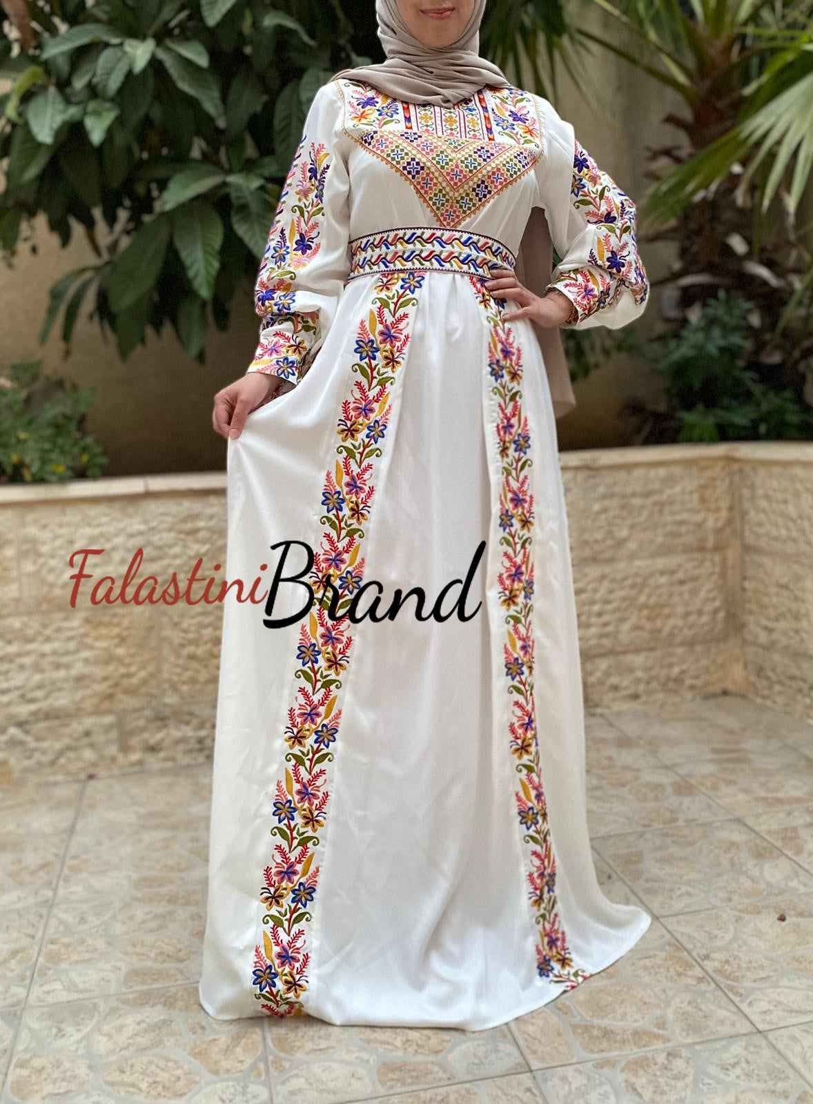 White Satin Flowy Thob Dress With Colorful Gorgeous Embroidery
