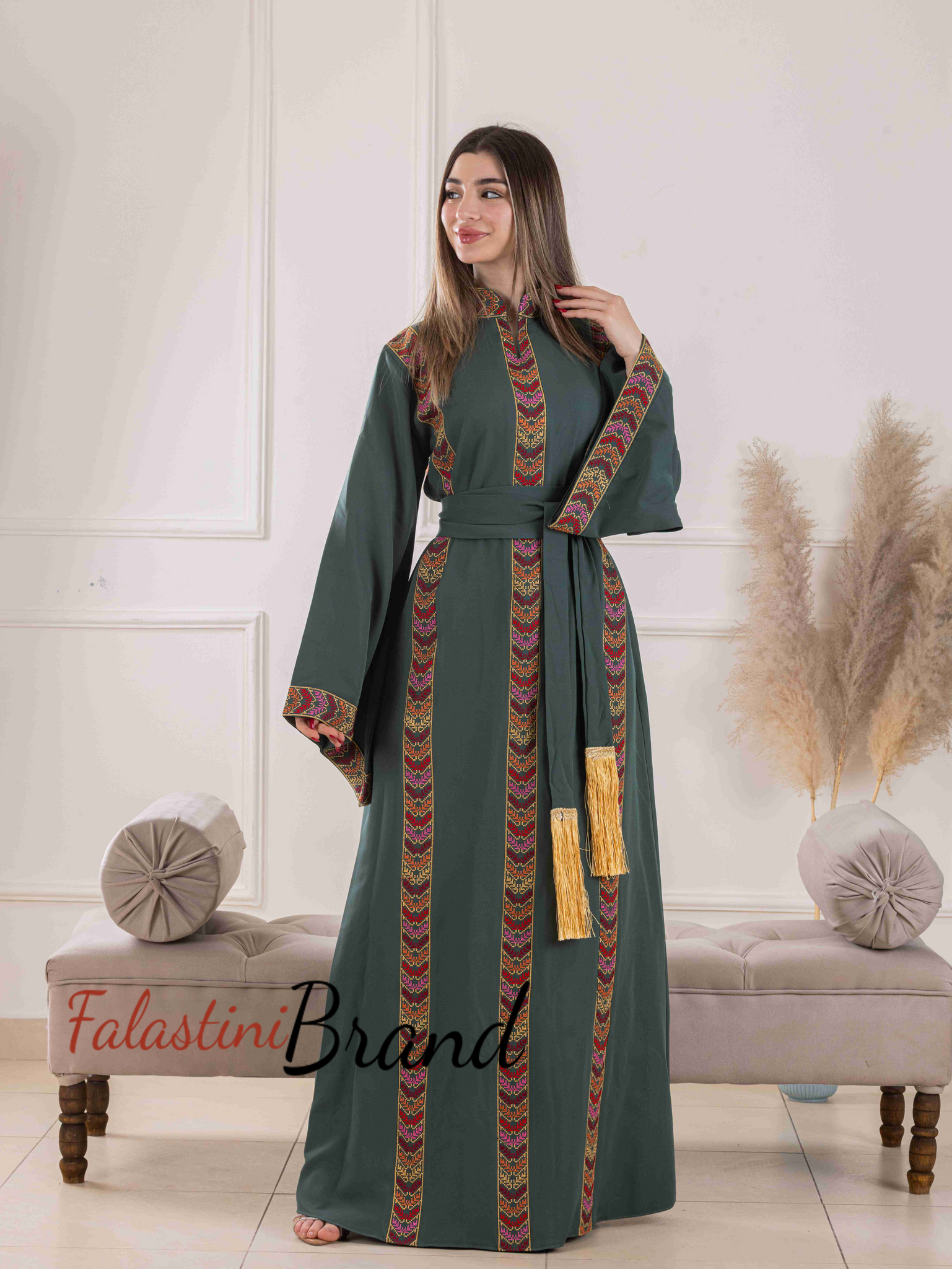 Elegant Palestinian Green Embroidered Stripes Abaya Dress with Wide Sleeves