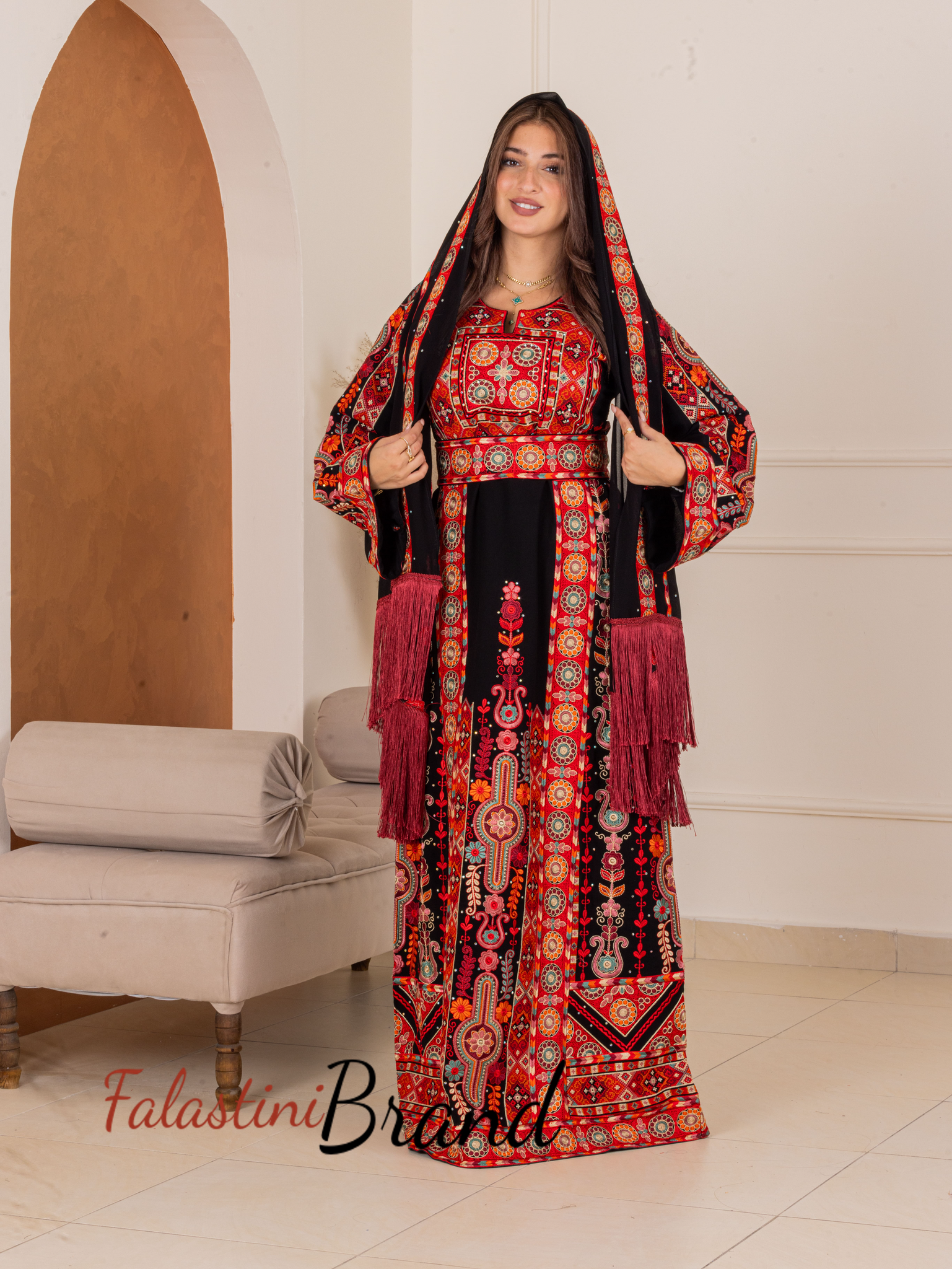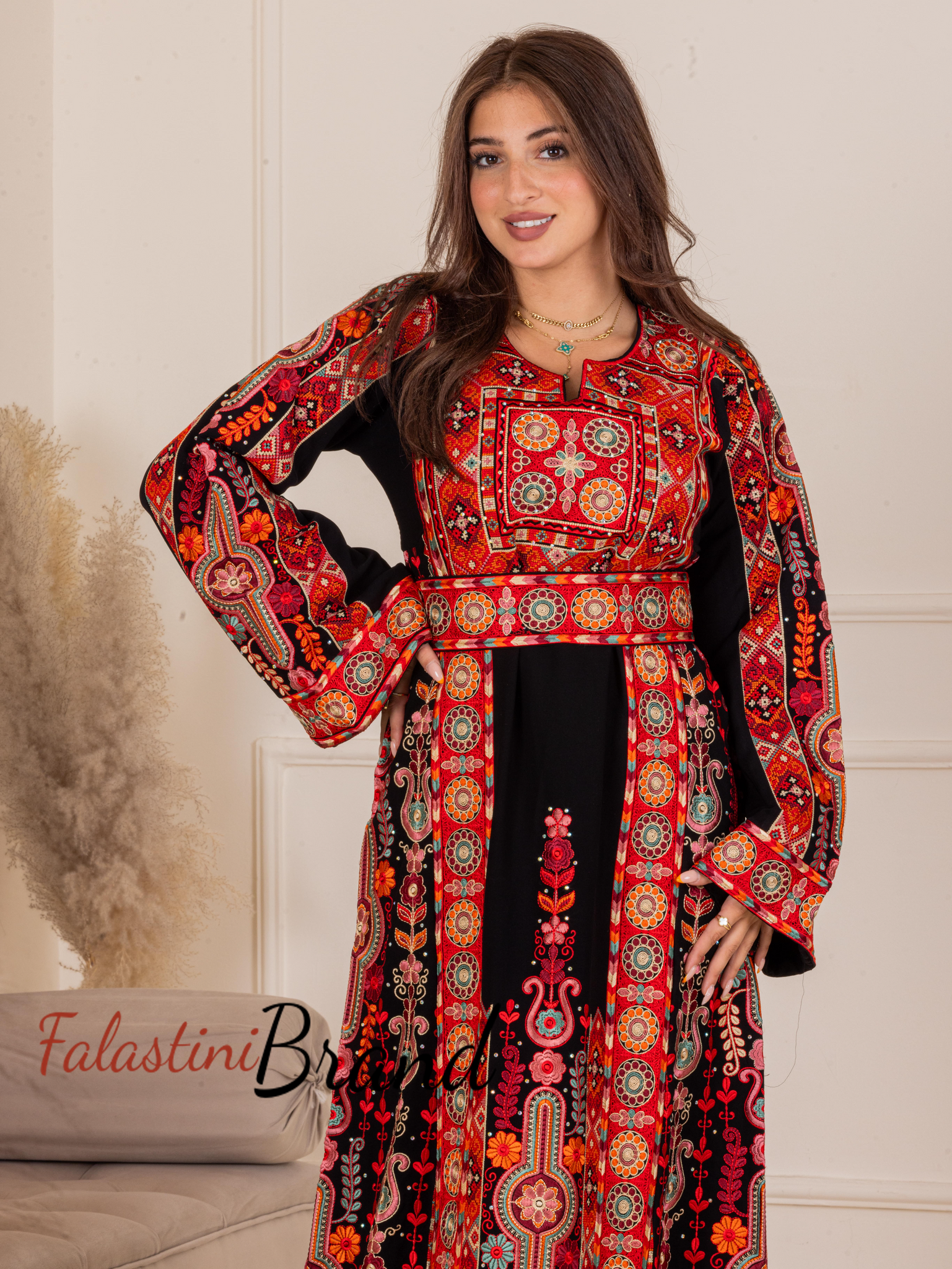Elegant Black and Red Malak Like Palestinian embroidered dress