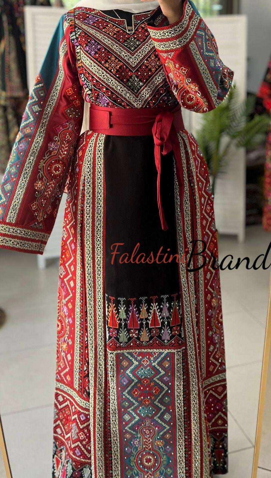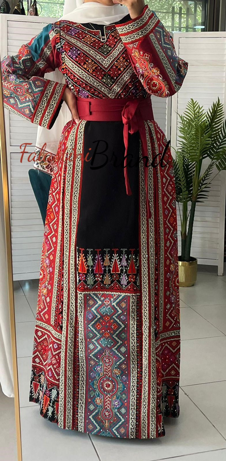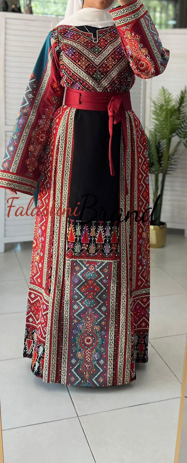 Elegant Black and Burgundy and Turquoise Palestinian embroidered dress