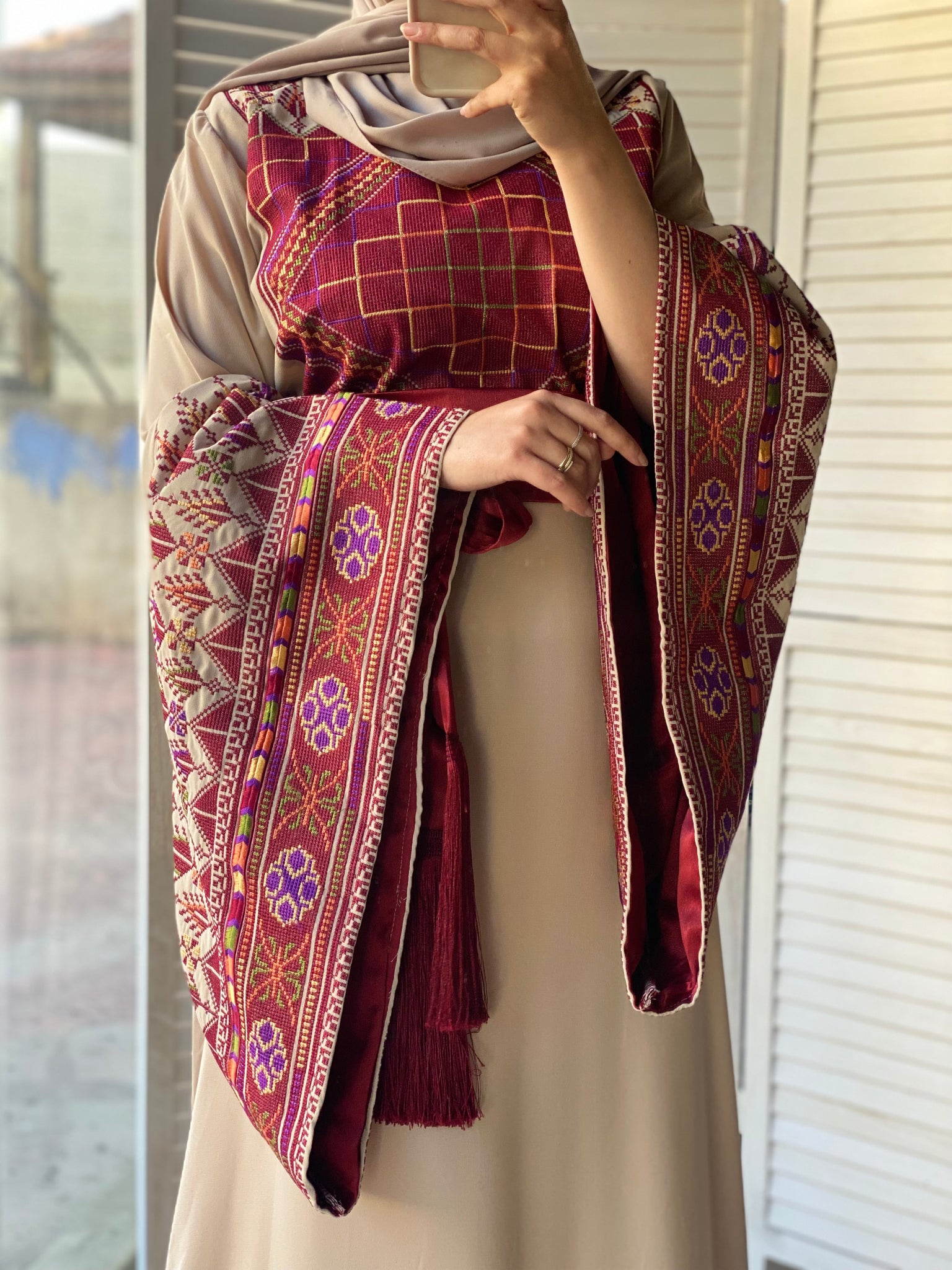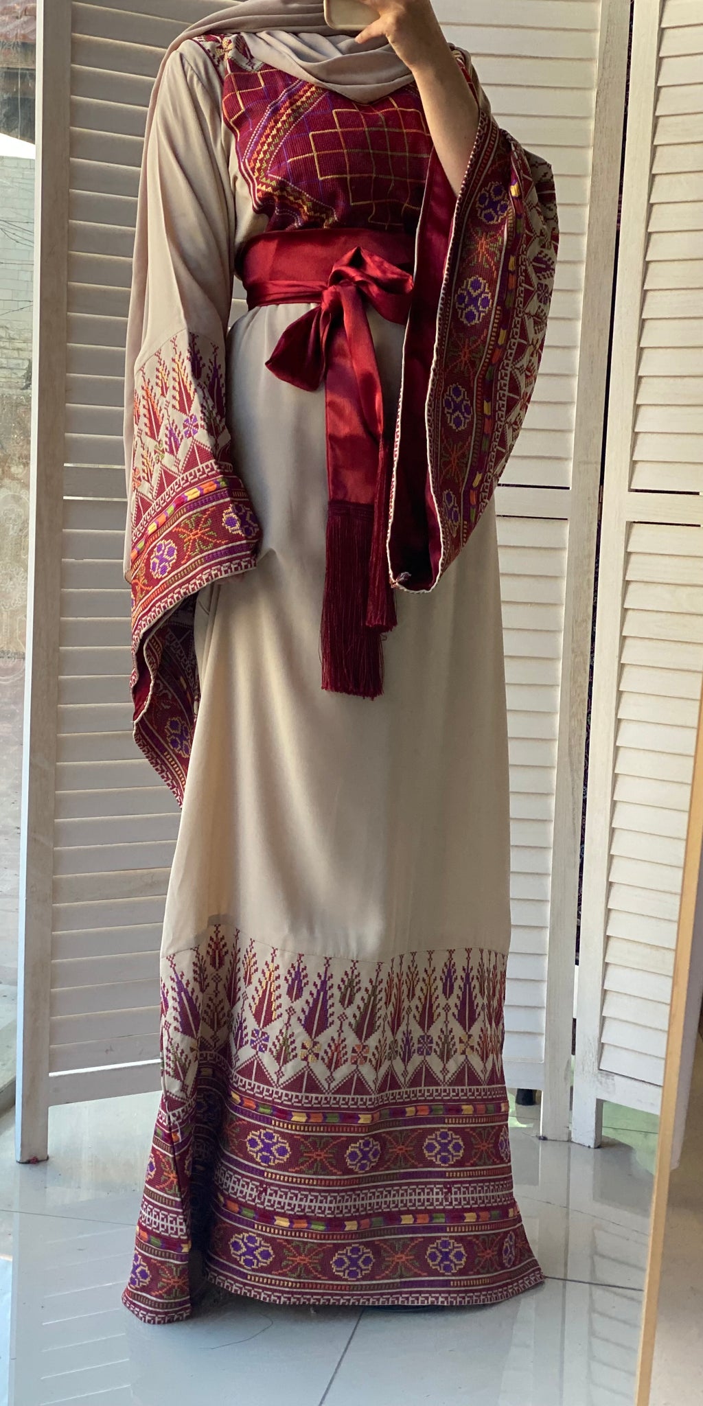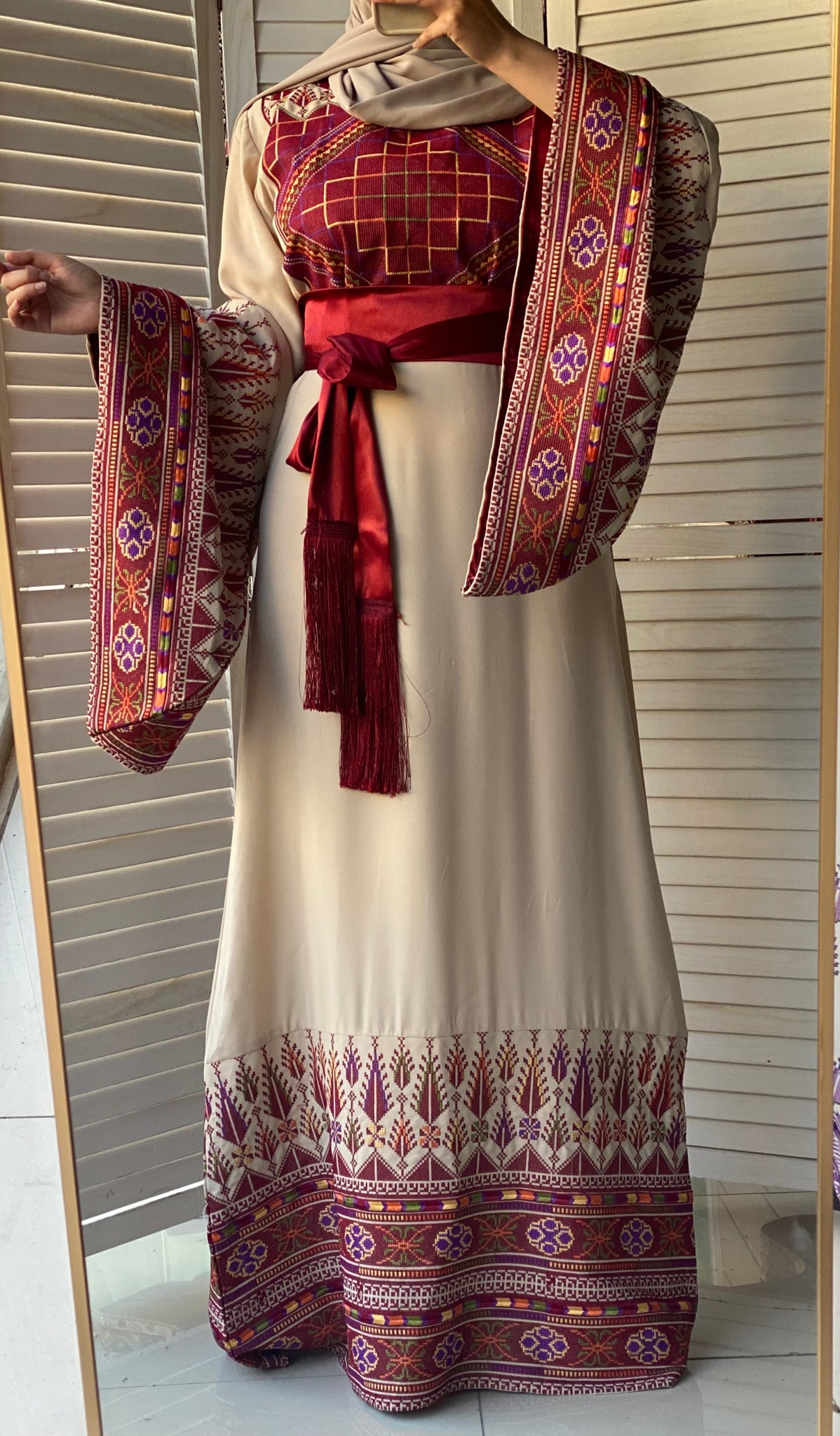 Very Unique Radan Sleeves Beige and Burgundy Thobe with Dense Embroidery and Satin Details